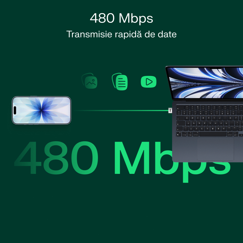 • Transmisie rapidă a datelor – oferă viteza de transfer de până la 480 Mbps, permițând transferul rapid și eficient de fișiere.