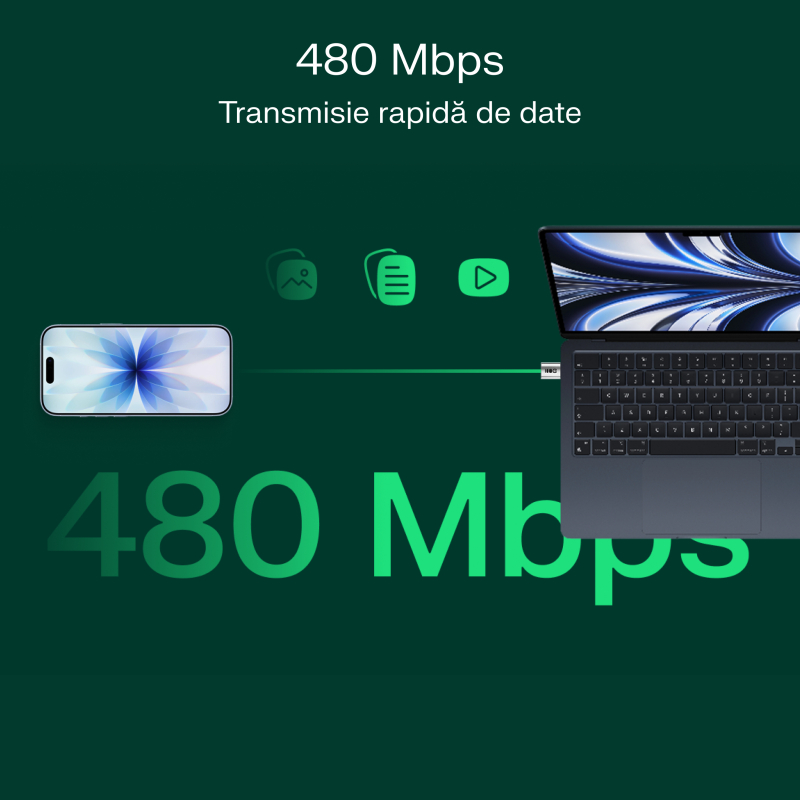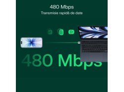 Adaptorul suportă o viteză de transfer de până la 480 Mbps, ceea ce permite copierea rapidă și comodă a fotografiilor, filmelor sau documentelor între dispozitive.