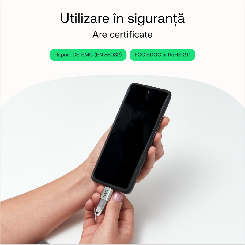 Adaptori sunt proiectați în Polonia de Greencell și respectă norme stricte de siguranță. Au certificări CE-EMC Report (EN 55032), FCC SDOC și RoHS 2.0, care confirmă calitatea și conformitatea lor cu standardele.